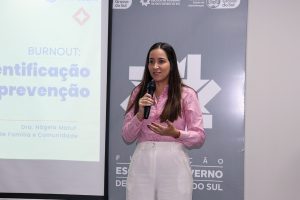 A programação incluiu duas palestras voltadas ao bem-estar e à saúde emocional das mulheres no ambiente profissional e pessoal. A primeira palestra foi conduzida pela Dra. Nágela Maluf, médica da Família e Comunidade, que abordou o tema “Burnout: Identificação e Prevenção”. Durante a apresentação, a especialista explicou os principais sinais da síndrome de burnout, os impactos do esgotamento mental no cotidiano e destacou a importância de reconhecer os sintomas precocemente, além de adotar práticas que favoreçam o equilíbrio entre trabalho, saúde e qualidade de vida.